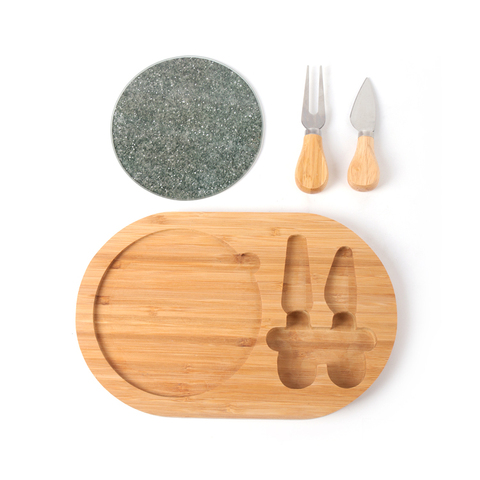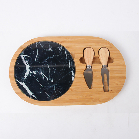מכירה לוהטת פרימיום עגול עץ זכוכית נירוסטה גבינת חיתוך לוח סט עם ידית